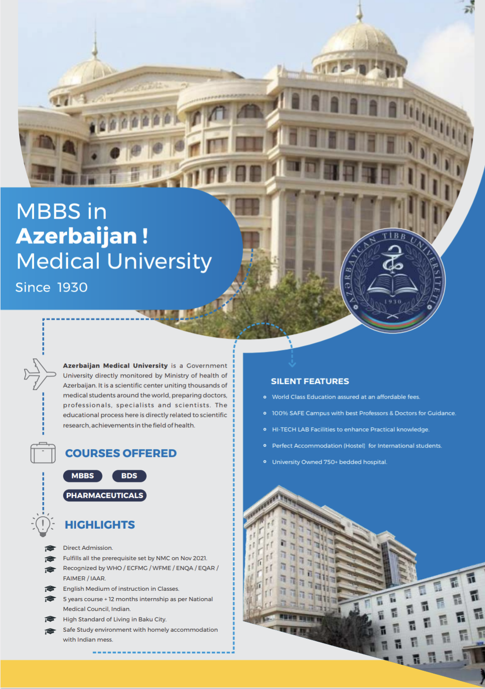 Azerbaijan Medical University (AMU) founded in 1930, is one of the largest and most prestigious higher educational establishments in the country. There are 5 faculties which include: General Medicine, Medical Prophylactics, Dentistry, Military Medicine, Pharmaceutic.