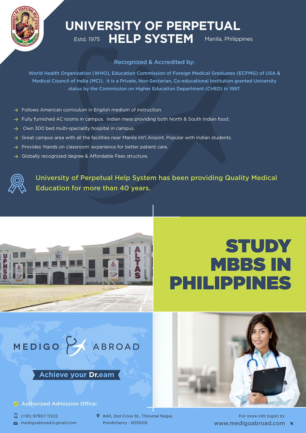 The University of Perpetual Help System Dalta (UPHSD) , located in Las Pinas, Manila, is a highly recognised Institute providing quality Medical Education for more than 40 years. The University of Perpetual Help has 3 major campuses in Las Pinas, Molino and Calamba. The campus located in Las Pinas has a student population of around 12,000 and employs about 1,500 teaching and non-teaching staffs. It offers more than 70 undergraduate and 10 postgraduate academic programs.